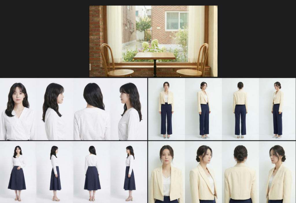 일관성을 유지하기 위해 레퍼런스로 캐릭터의 얼굴이 잘 나온 턴 어라운드 샷, 복장을 잘 확인할 수 있는 턴어라운드 샷, 그리고 배경이 되는 샷을 넣었다.